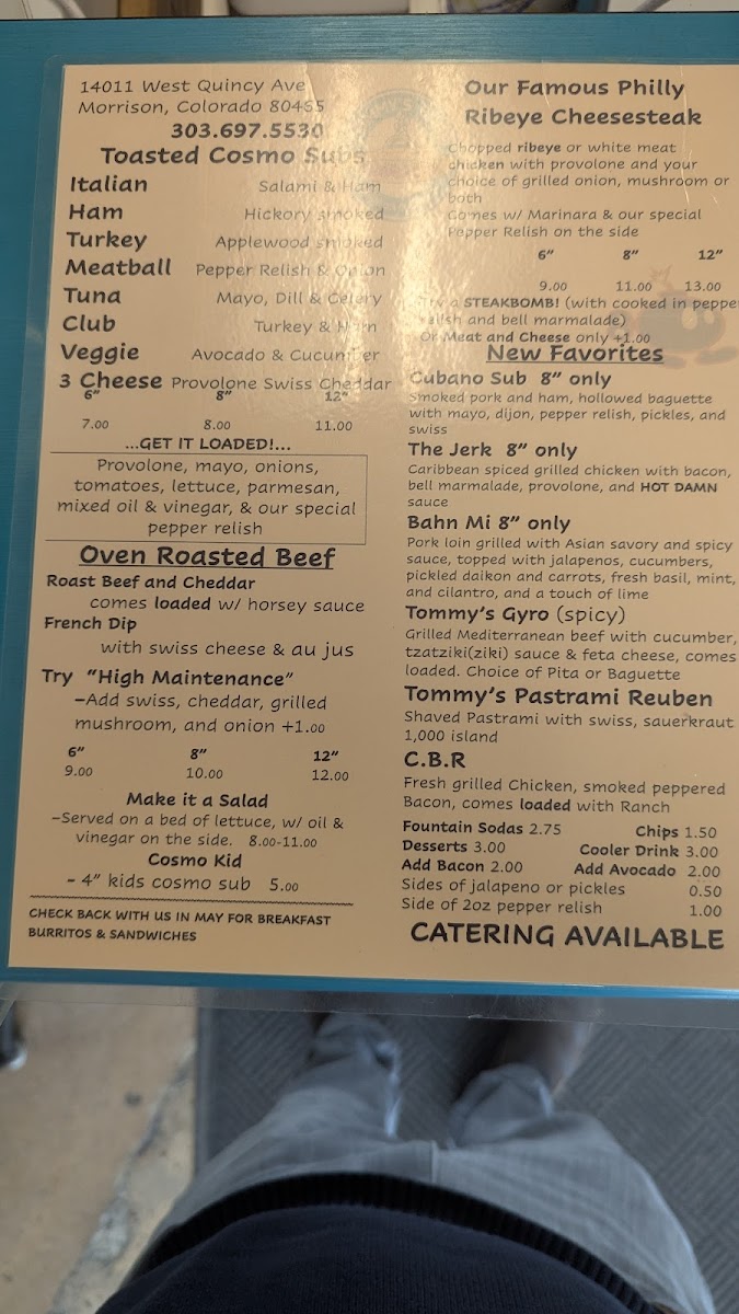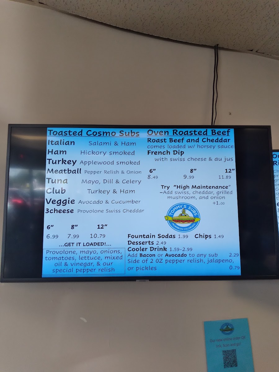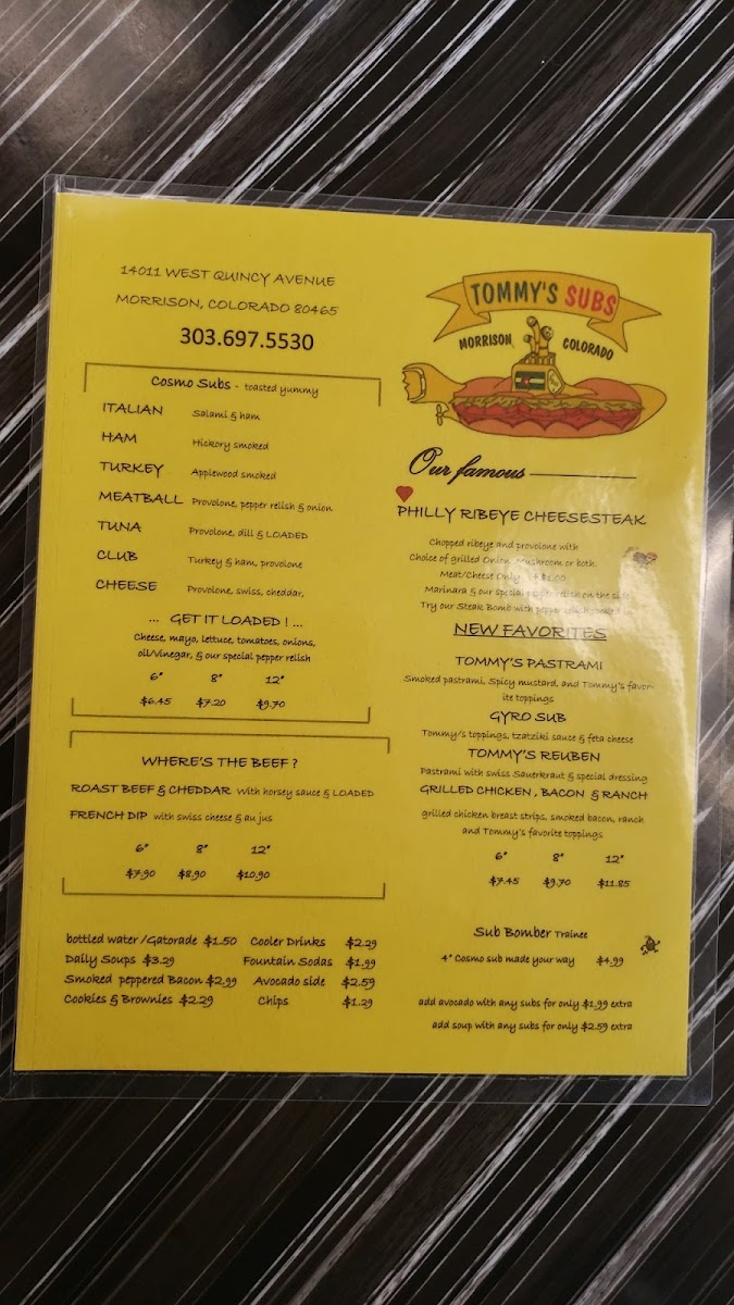 Welcome to Tommy's Subs, a delightful treasure nestled at 14011 W Quincy Ave in Morrison, Colorado. This eatery specializes in a diverse array of mouthwatering subs that cater to all taste buds. Among their new favorites is the Jerk, a standout that’s sure to tantalize your palate. The menu features a range of classics, including the Hickory Smoked Ham, Tommy’s Meatball, and the ever-popular Three Cheese. Vegetarians will appreciate the fresh Veggie Sub, while meat lovers can indulge in the ribeye Philly cheesesteak, praised by patrons for its rich flavors.